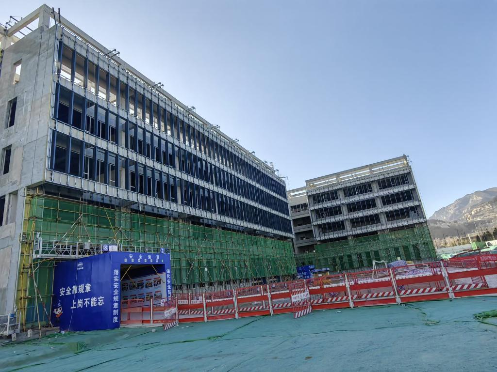 2)外装:外墙干挂石材龙骨安装完成95%,窗框安装完成60%。铝单板格栅安装完成。
