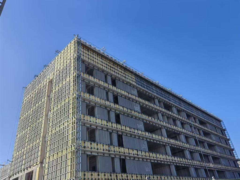 4)外装:外墙干挂石材龙骨安装完成95%,窗框安装完成80%。铝单板格栅安装完成。